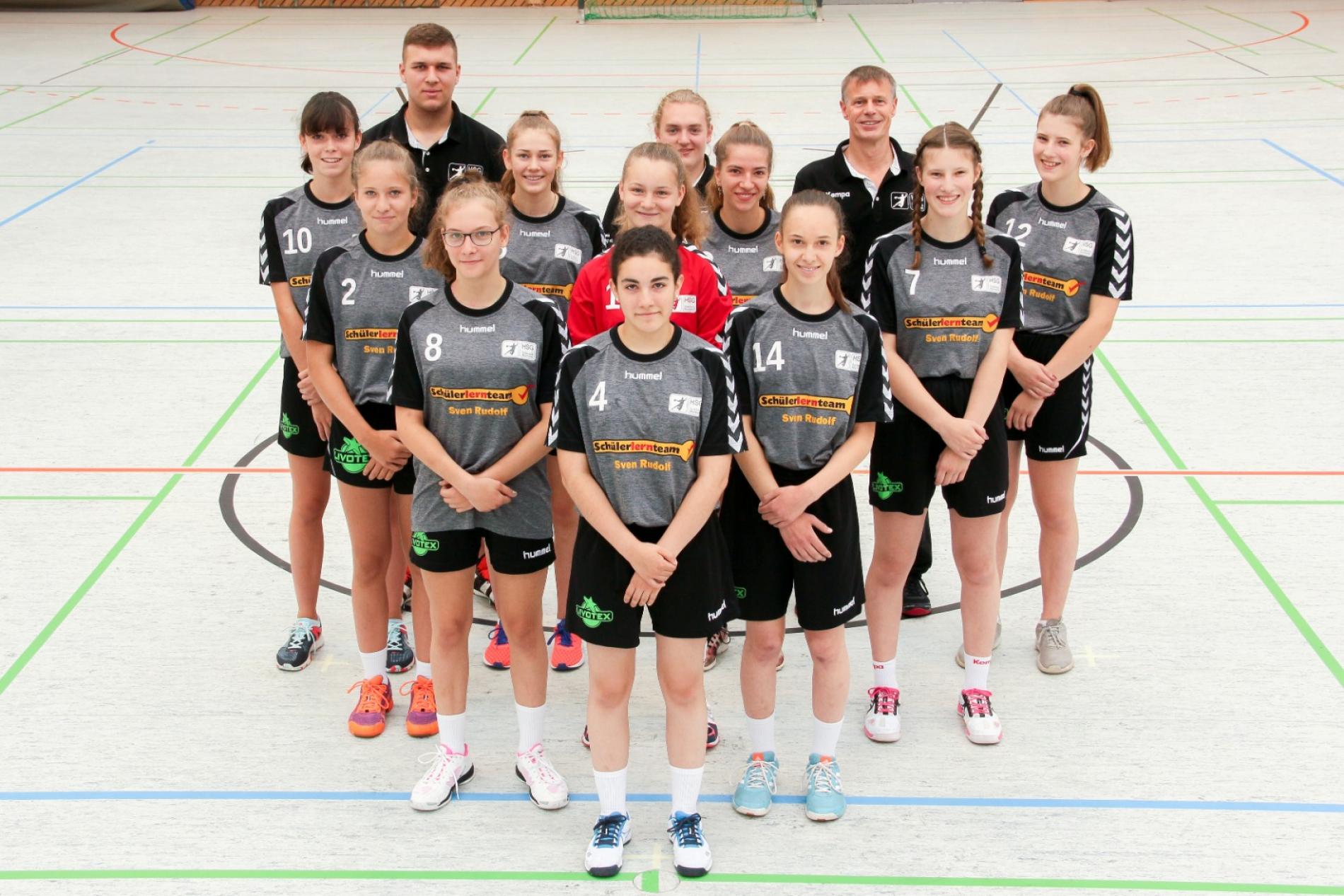 von hinten von links nach rechts: Trainer Pascal Weiß, Trainer Lewin Kollak und Trainer Daniel Drechsel, Sina Reibl (10), Nina Feil (5), Madita Kreder (3), Nele Drechsel (12), Diana Reibl (2), Wiebke Geyer (1), Leni Drechsel (7), Maren Trefz (8), Kim Schaible (14), Maike Buchwald (4)